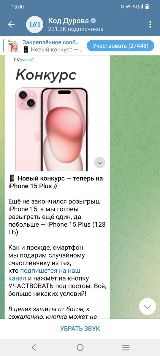 Как участвовать в конкурсе на Iphone 15 128 ГБ от телеграмм канала "Код Дурова"?
