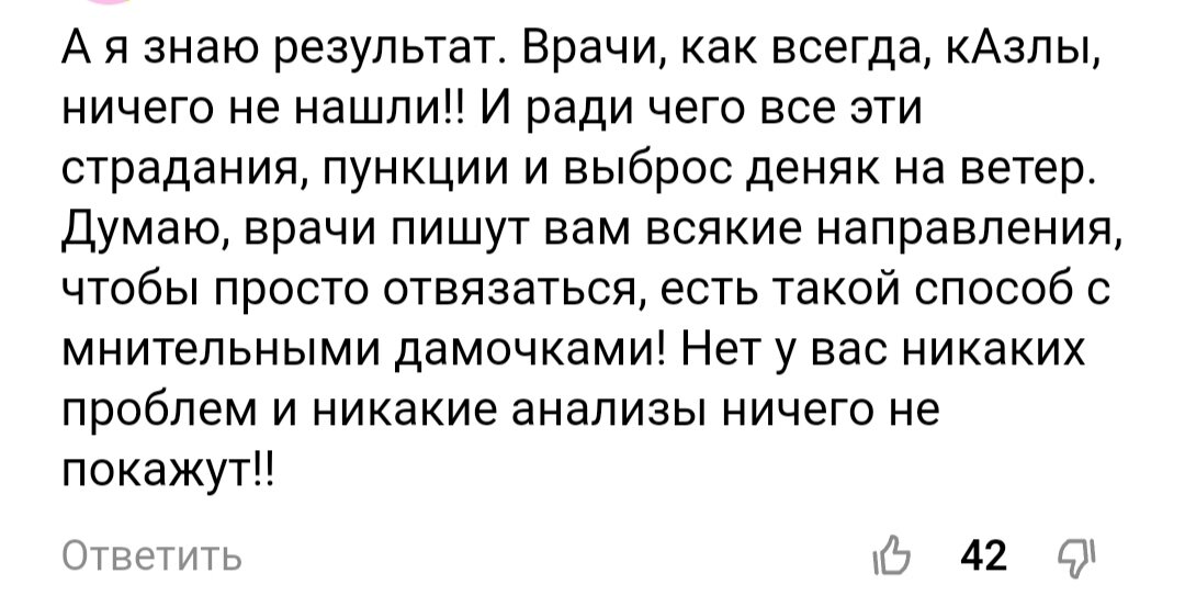 Это под другой статьёй было, тоже про мою кровь. Я тогда этого человека спросила, почему у меня тогда по её мнению такие анализы? На что она отбрехалась, что она не врач, что "чего ж ты у гематолога не спросила? " А на вопрос, зачем мне тогда по её мнению назначили эту пункцию, знаете, чего написала? Вот👇😂