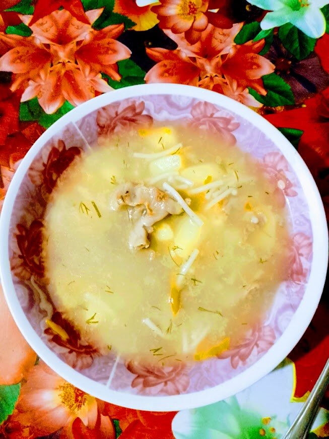 Истории из жизни. Не знаю, как кто я обожаю такой супчик еще с детства. Вот и решила приготовить Суп да с куриными потрошками. Как раз в морозильной камере лоток куриных желудков дождался своего звездного часа. Варить такой супчик сразу, занимает какое то время и я решила, разбить приготовление на два этапа. Вечером разморозила желудки, промыла, залила водой и поставила на медленный огонь тушиться, туда добавила мелко нарезанный лук. Пока я смотрела телевизор, общалась с дочерью, мои желудки сварились, я их чуток еще обжарила на растительном масле, когда вода выкипела там же в жаровне и опять добавила кипятка, еще немножко потомила. Сегодня быстренько почистила три картофелины , порезала их и засыпала в кипящую воду, затем добавила тертой на терке моркови ,и резаного лучка. Через 15 минут, добавила уже готовые желудки, подсолила, добавила приправу для супов и варила до готовности картофеля ,потом добавила паутинку (макарошки), все суп готов. В завершение посыпала укропчик, з