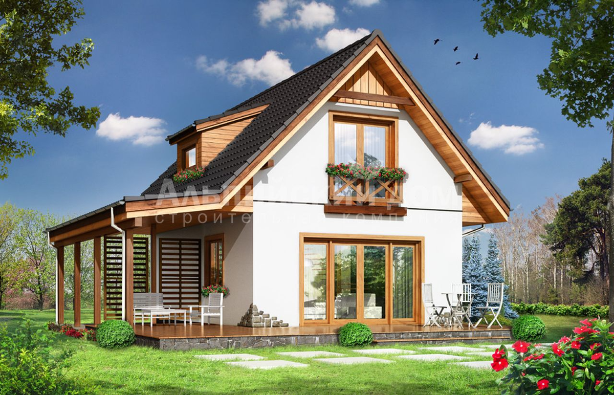 Фасады украшают: гаражный навес сбоку дома и большая, садовая терраса.