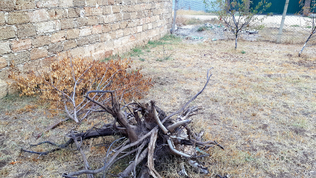 Выкорчевали только грецкий орех, дерево было старым и росло на месте будущего домика. Один пень сейчас остался. Пока не вывезли, может его на угли для мангала пустить можно будет.