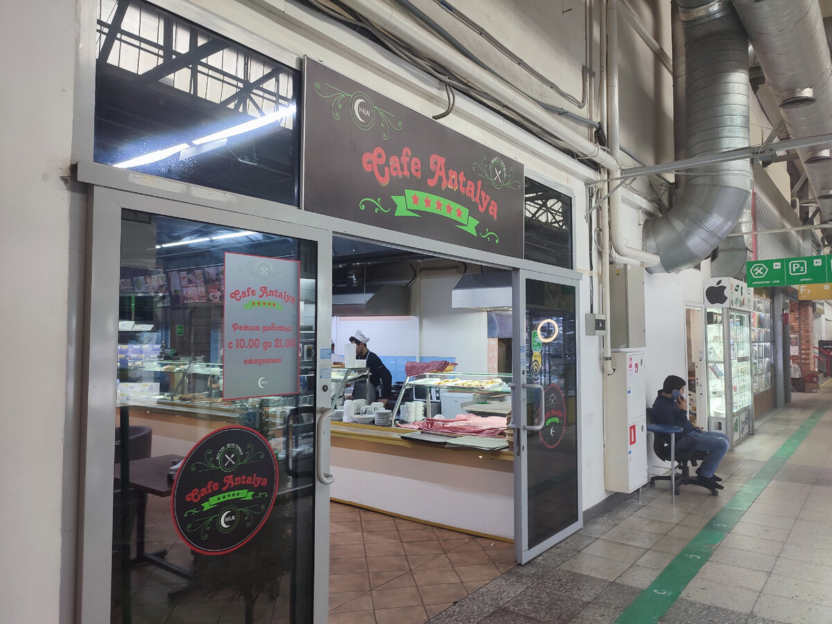 На знаменитом рынке в Москве, между торговых рядов с телефонами спряталось настоящее турецкое кафе "Анталия". Ну как мы могли пройти мимо этого островка кулинарии в техно аду? Наружное оформление крайне простое и работает на стереотипах. "5 звёзд" как отель, название "Анталия", как популярный курорт. Эта простота скорее привлекает, чем вызывает негатив. Ну что же, переходим порог! Что касается столов, то тут всё очень плохо. Либо сотрудники не успели привести всё в чистый вид, либо даже и не пытались. Грязь нас встретила повсюду. На столах, на сиденьях, на полу... голову поднимать было страшно, по этому потолок останется террой инкогнито. В зале много места. На момент посещения столы были заняты примерно на половину. И обслуживает это всё одна единственная официантка, что очень сказывается на скорости подачи блюд и, возможно, является причиной грязи вокруг. Концепция Анталийских отельных шведских столов мне очень напоминает обычный стол-раздачу в столовой, по крайней мере здесь она реа