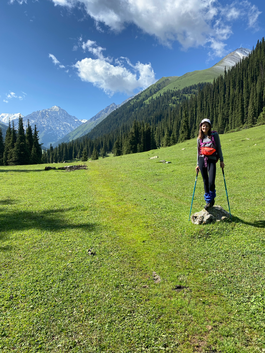 В 08:40 мы начали путь. Дорогу до озера Ала-куль я бы разделила на несколько этапов. Первый этап вы идёте 2,4 км от домика Эльзы, вдоль бурной реки Арашан без набора высоты. Второй этап, вы сворачиваете резко направо под углом 90° и начинаете идти 1,5 км в гору, по хвойному и ароматному лесу. Третий этап, это отрезок выше зоны леса и до Юрточного кемпа, идти его 5,3 км, по альпийским лугам с превосходными видами на горы, которые украсил ночной дождеснег. И последний, четвертый этап, от юрт до вершины перевала, 1,4 км, мимо камней и ослепляющего снега.