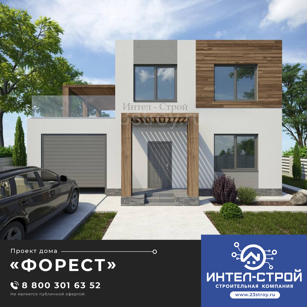 В соответствии со стилистикой этого архитектурного направления, отделка фасада выполнена современными материалами: штукатуркой бежевого и серого тонов и декоративными элементами, стилизованными под дерево. Цоколь дома по проекту может быть облицован искусственным камнем. Коротко о проекте дома: