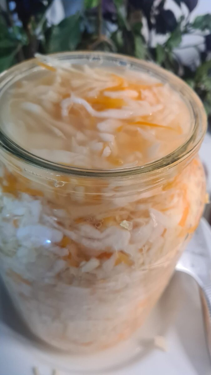 В воскресенье я выставила пост по квашению капусты. Не оригинальный, простой рецепт. Но вот капуста откликнулась на него очень интересно. Открыв свою кастрюльку в понедельник, я страшно удивилась, что в моем "солении" нет никакого сока. Ну просто нисколечки! Такое было у меня в прошлом году и я тогда сразу залила капуту рассолом. Капуста не сочная, обидно, но есть способы решения этого вопроса. Однако, на этот раз я подумала, что не буду заливать, а посмотрю, что будет дальше. Я переложила всю капусту в 2-х литровую банку с широким дном и очень плотно, как и в кастрюле делала, её примяла, уплотнила. капуста сама была сырой, а вот сока и не видно, таки не показался. На следующее утро, я подошла к своему "творению" и обнаружила, что сока по горлышко. Отдала таки капустка сок. То есть, ей нужно было время. а мне терпение. И вот сегодня Второй день наблюдений за квашением. Я сделала фотографии. А хозяюшкам делать выводы:). Завтра вечером отправлю в холодильник. чтобы не перекисла.