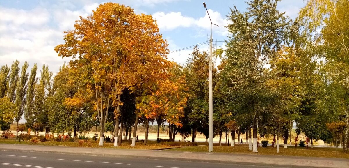 Осень радует своей красотой и величием. Листья деревьев окрашены все золотой листвой. Они медленно опадают и устилают все вокруг себя плотным пестрым ковром. Погода бывает разной. Иногда осеннее небо становится мрачно-серым, плаксивым. А иногда и ярко- синим. Солнце уже прохладное. На его тепло надеяться уже нелепо. Осенняя природа царственно красива. Вся в радужных тонах ! На фото Беларусь г. Мозырь , фото Евгении Телешовой.