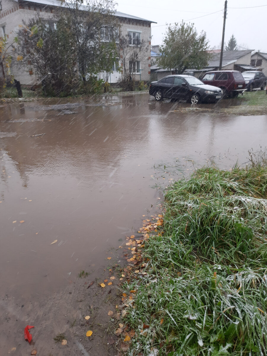 У нас сегодня шёл снег. Вон его немного видно в полёте и на траве лежит. А это половодье-последствие ночного дождя. Фотографировала утром, к вечеру вода остатки островков скрыла.
