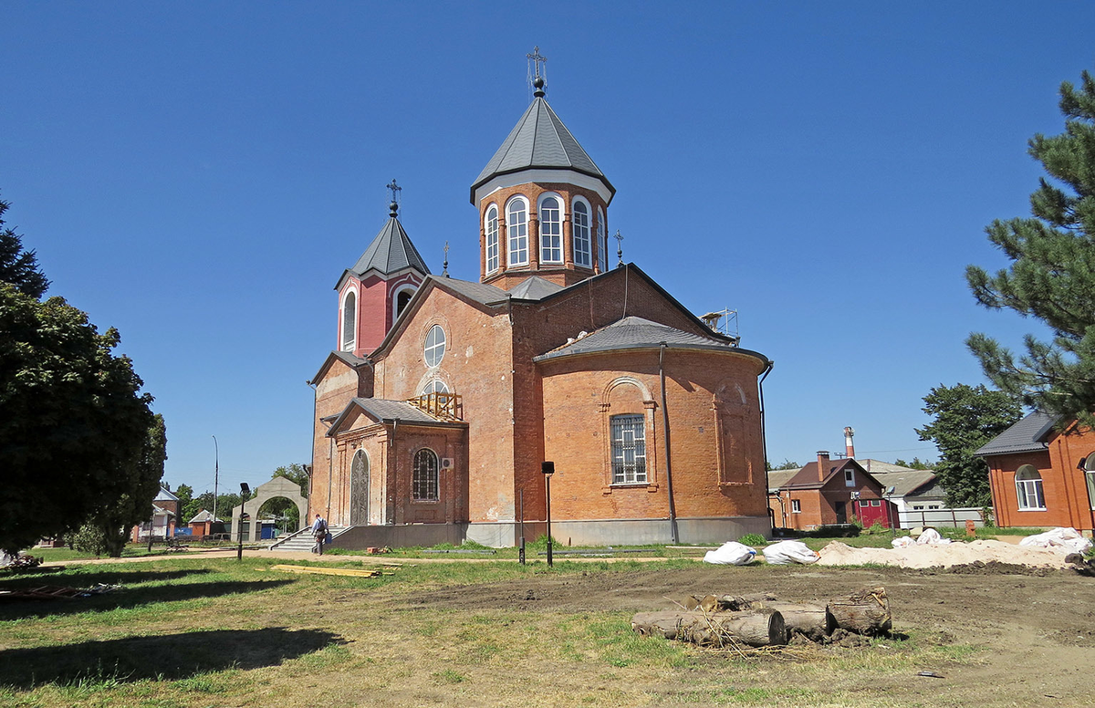 Для адыгов исход черкесогаев означал экономическую смерть: уже в 1840 году в аулах начал голод, вызвавший жесточайшие набеги на русские крепости у Чёрного моря. В той стороне горцев пытались снабжать англичане и турки, а вот на Кубани всё затихло ещё до окончания войны. Аул рос, и уже в 1840-42 годах в нём появилась деревянная церковь. Нынешний храм возвели в 1857-61 годах, и одновременно он был цитаделью - обратите внимание на крепостную стену, разобранную лишь в 1930-х годах.