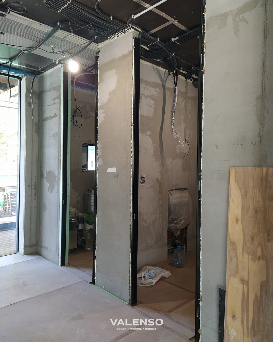 Давно мы не показывали процесс монтажа. Это загородный дом в Зеленогорске и на текущем этапе мы проводим установку дверных коробок. Двери тут необычные, они высотой 3200 мм. Все двери высотой до потолка и без верхней планки. Соответственно, и коробки для них нужны необычные. При этом часть из полотен дверей будут с отделкой керамогранитом толщиной 6 мм. При такой отделке толщина полотна двери будет 80 мм. Дверь такой высоты и такой толщины возможно сделать только из особенного профиля и про него нам есть что рассказать. Но об этом позже. Довольно часто строители нас спрашивают: как подойти отделкой к дверной коробке, как выполнить необходимые элементы для таких коробок. Мы всегда предоставляем строителям всю необходимую информацию. А сегодняшний пост может послужить демонстрацией решений именно от этой бригады строителей. Посмотрите как подготовлены стены и сделаны элементы. В санузлах на стенах будет керамогранит, потолок натяжной. Мы обязательно вернёмся сюда, когда картинка измени