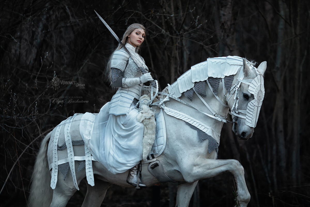 Наконец я могу презентовать вам один из самых глобальных моих проектов! Образ фэнтезийной всадницы в доспехах на белом коне, скорее собирательный, как и всегда, но многие увидели в нем и отсылку к эльфам и галадриэль в новой редакции от Netflix, и всадницу Рохана, и Белую Королеву из Алисы в стране чудес, и даже Снежную Королеву... Как бы то ни было, готовила я эту съемку года 3! очень долго делали и переделывали доспехи, как человеческие, так и на коня. я плела кольчужные элементы для амуниции, сбивая руки в кровь. Затем были долгие и кропотливые поиски подходящего по масти и статности боевого коня. Это оказалось не так просто! В итоге выбор пал на очень горячего испанца - андалуза Орио. Амуниция села на него как влитая! Ну и напоследок мы сильно помучались в ожидании подходящего времени года, чтобы не было зелени и солнца, которые не вписывались в атмосферу нашего образа, т чтобы не было снега, с которым мы бы слились в одно белое пятно. И при этом было достаточно тепло чтобы ра