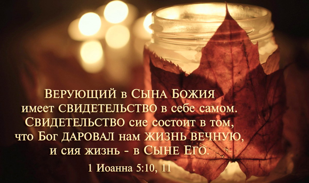 «Если мы принимаем свидетельство человеческое, свидетельство Божие — больше, ибо это свидетельство Божие, которым Бог свидетельствовал о Сыне Своём. Верующий в Сына Божьего имеет свидетельство в себе самом; не верующий Богу представляет Его лживым, потому что не верует в свидетельство, которым Бог свидетельствовал о Сыне Своём. Свидетельство это состоит в том, что Бог даровал нам жизнь вечную, и эта жизнь в Сыне Его. Имеющий Сына (Божьего) имеет жизнь; не имеющий Сына Божьего не имеет жизни» (1 Ин. 5:9–12).