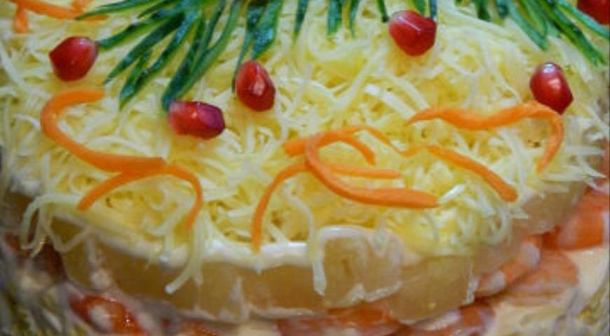 Ингредиенты: Шампиньоны-250гр., яйца-3шт., креветки в панцирях-200гр., консервированные ананасы-1 банка., сыр твёрдый-80гр., майонез-100гр., масло растительное для жарки-2ст.л., соль-по вкусу. Приготовление: Шампиньоны помыть, обсушить и нарезать ломтиками. Обжарить на растительном масле до готовности, посолить, остудить. Яйца отварить, почистить и потереть на крупной тёрке. Креветки отварить в подсолённой воде, освободить от панциря. Сыр натереть на мелкой тёрке. Собираем слои: 1. слой-грибы жареные, майонез. 2. слой-яйца, майонез. 3. слой-ананас кубиками, майонез. 4. слой-креветки, майонез. 5. слой-сыр тёртый, майонез. Украсить по желанию: например, еловая веточка из огурца, серпантин из моркови. Приятного аппетита!