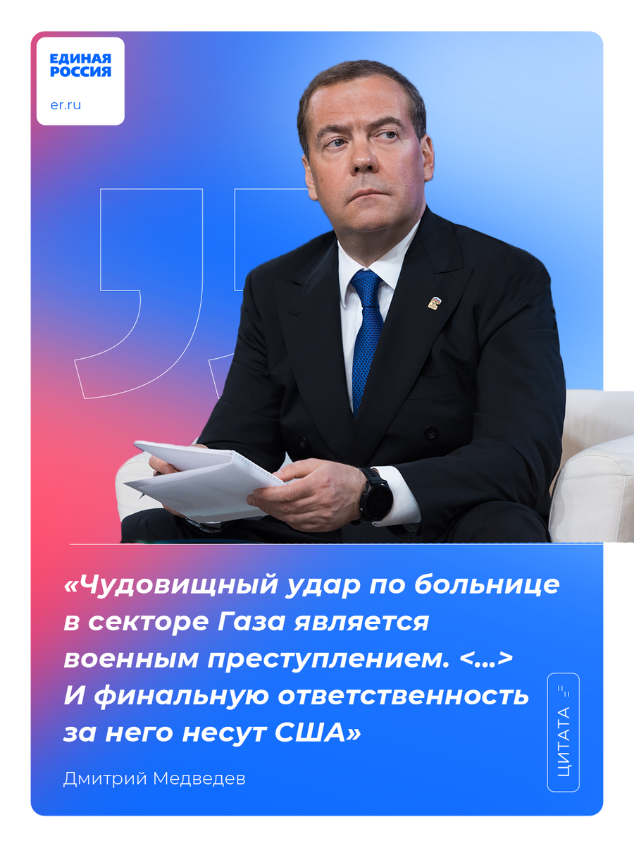 Председатель Единой России, заместитель председателя Совбеза РФ Дмитрий Медведев возложил вину в трагедии в секторе Газа на США. По предварительным данным в результате атаки на госпиталь с мирными людьми погибло несколько сотен человек