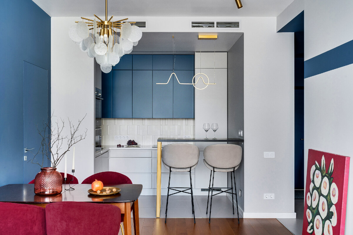 Основная идея этого проекта заключалась в создании функционального яркого и энергетически насыщенного пространства, в которое идеально впишутся предметы искусства и различный декор. Благодаря смешению стилей интерьер получился современным и изысканным. Интерьер создавался для семьи из пяти человек — родителей их троих дочерей. Заказчики очень активные: постоянно путешествуют, посещают всевозможные мероприятия, встречаются с друзьями. Перед началом работы над проектом мы с хозяйкой обсуждали детали и пожелания. «Точно хочу цвет! — первое, что она мне сказала. — Но в то же время интерьер должен быть для жизни, с продуманным хранением вещей». Дизайн-проект мы сделали быстро, так как заказчикам нравились мои идеи. Общий срок реализации составил девять месяцев. Все стены комнат (кроме санузлов) выполнены под покраску. На полу в жилых помещениях уложена инженерная доска благородного и насыщенного дубового оттенка. На кухне и в зоне прихожей пол из керамогранита — практичное решение, которое
