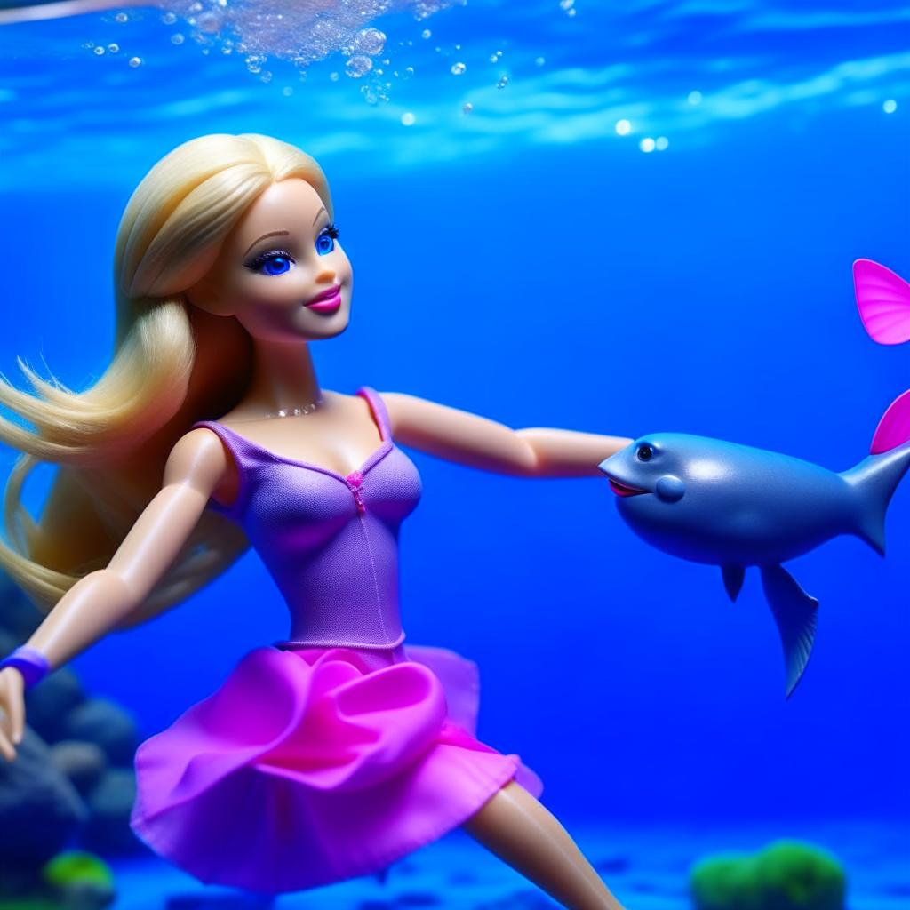 Когда-то, в далеком королевстве, жила прекрасная девочка по имени Барби. У нее были длинные золотистые волосы, голубые глаза и всегда хорошее настроение. Она была известна своей добротой и умением находить волшебство в мире вокруг себя. У нее была одна большая мечта – она хотела встретить дельфинов в их магическом морском королевстве. Самым обычным утром Барби отправилась на прогулку по берегу океана. Это была обычная прогулка ничем не отличающаяся от предыдущих. Она шла по пляжу и разглядывала морские ракушки и морские звезды. Вдруг, на горизонте, она увидела что-то блестящее и волшебное. Это были дельфины, плывущие вместе и исполняющие свои магические танцы. Барби была в восторге от этого невероятного зрелища и подбежала ближе к океану, чтобы наблюдать за этими великолепными созданиями. Когда она приблизилась к воде, один из дельфинов выскочил из воды и заговорил с ней. "Привет, Барби," сказал дельфин. "Мы долго ждали твоего прихода. Мы слышали о твоей доброте и твоей способности вид