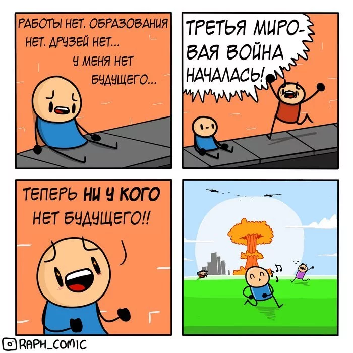 Почему люди любят комиксы – это понятно, а вот почему их приводят в восторг рисованные истории с обескураживающим подтекстом – это хороший вопрос. Но художник Раф (Raph) предпочитает не задумываться над ответами, а предлагает сюжеты, от которых голова идет кругом. Об авторе Найти сведения о талантливом юноше сложно, он вообще не рассказывает о себе, своей жизни, сводя темы бесед исключительно к искусству. Известно, что у Рафа более 70 тысяч подписчиков в социальных сетях, живет он в Мельбурне (Австралия) и обожает «остренькое». Под остротой Raph подразумевает все – от жизненных ситуаций до еды. Обладая умением превращать даже простейшую ситуацию в абсурд, он доводит абстракцию до пиковой точки и не предлагает готового решения, а заставляет задуматься. Вполне возможно, что все эти навыки парень получил с опытом, ведь рисовать комиксы он начал еще в школе. Ситуация проста до банальности – стало скучно, изрисовал «поля» в тетради, а потом пошло-поехало. Как признается художник, комиксы