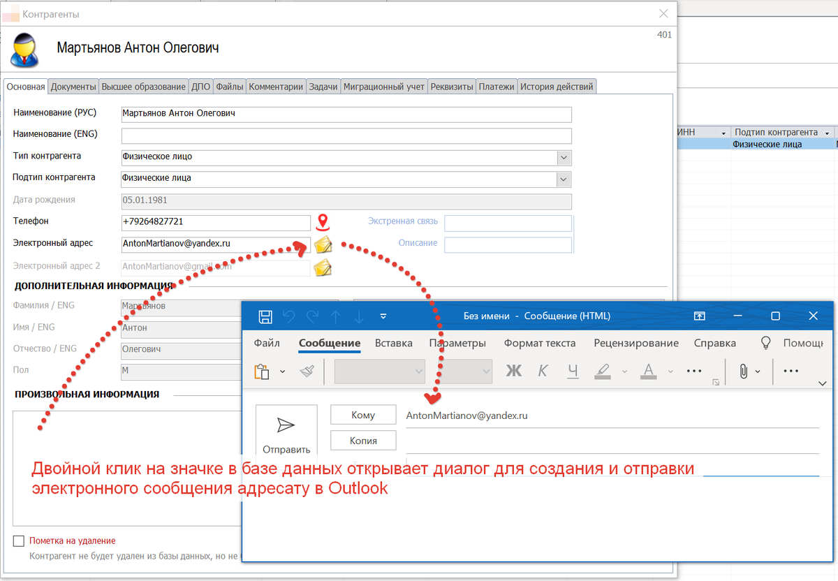 Информационная система, как и человек, не должна быть замкнута на себе; обязательное условие успешной работы – взаимодействие и открытость + скорость. Возможности интеграции позволяют автоматически получать необходимые сведения из интернета и взаимодействовать с другими приложениями. Казалось бы, для запуска диалога и начала редактирования электронного письма необходимо 10-15 секунд. Но зачем тратить это время, если можно двумя кликами мыши открыть диалог Outlook? Ежедневно менеджеры рассылают десятки писем. Этот процесс можно ускорить. Каждое отправленное письмо можно сохранять в базе данных в хранилище документов клиента. Мы часто заполняем, редактируем договоры или дополнительные соглашения. Неизменный атрибут любого документа - реквизиты клиента. В базе данных реквизиты хранятся в соответствующих полях. Для удобства менеджеров, которые занимаются подготовкой документов создана кнопка "сбора" и копирования реквизитов контрагента. Некоторые предприятия ведут адресные книги в Outlook.
