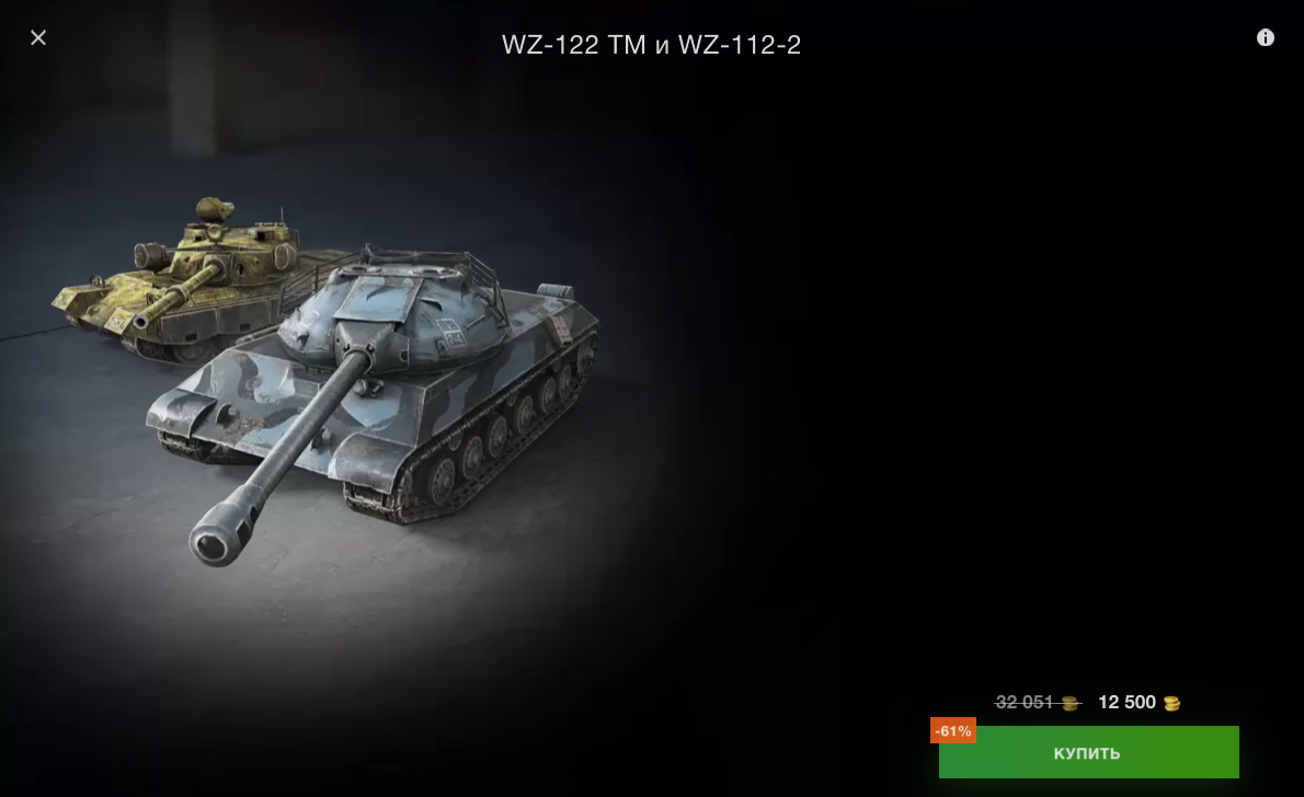 Он вполне закономерен. Я не порекомендовал ни один танк из пары, потому и сразу обоих брать тоже не стоит. Я бы такой набор и за 10к не взял бы. Максимум - подумал, если бы накинули плюшек. Поверьте, уж лучше взять условную СУ-130ПМ за 8500 и до конца жизни кайфовать на ней, чем тратить 12,5к на этот набор, а потом на новогоднем ауке смотреть на химеру, рогу и Акулу по 7к, пуская слюнки.