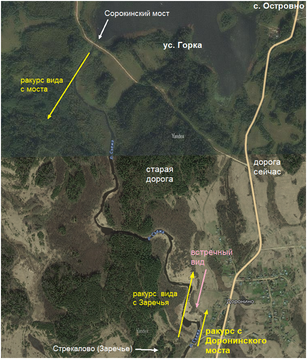 Тем более что севернее Стрекалово (Заречья) находятся очень высокие озовые холмы, покрытые сосновым лесом и они никак не позволили бы увидеть Стрекалово с Сорокинского моста, даже если бы вид был и прямой! Так что версия Архангельского была чисто умозрительной, когда сознание человека цепляется за одно-единственное совпадение и не замечает или игнорирует все не совпадающие факты.