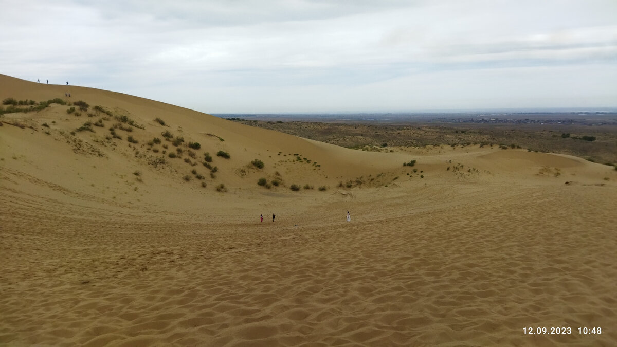 Во время моего пятидневного тура по Дагестану хотелось увидеть самые красивые и необычные локации. Увидеть пустыню, погулять по песочку – это казалось мне привлекательным. Недалеко от Махачкалы, всего в 30 км, находится большая гора из желтого песка, называемая бархан Сарыкум. Сарыкум так и переводится с кумыкского – «желтый песок». Он считается самым высоким в России и во всей Евразии. Высота – 262 метра, длина – 10-12 км, ширина 3-4 км. О причине его появления в Дагестане говорят, что в течение столетий ветра стачивали горы, приносили песок и образовали такую песчаную гору. Но есть и другие легенды и предания. Нашу группу привезли к стоянке и предложили подняться на песчаную гору, определили время на подъем, гуляние по песку и возвращение. Всего 45 минут, 15 минут на подъем и спуск и прогулка по бархану. Подниматься нужно было по металлической дорожке, рядом была уже устаревшая деревянная. На пути встречались смотровые площадки, на которых можно было осмотреться, перевести дух. Но