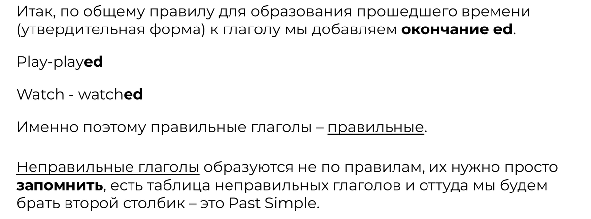 Напомню, блок 1 был Was и Were. Мы рассмотрели единый алгоритм запоминания для всех времен: Все времена учим по схеме: Итак, Past Simple. Блок 2. Смысловые глаголы. Утвердительная форма строится так: Здесь важно запомнить как произносится окончание ed В вопросительной и отрицательной форме мы знакомимся с вспомогательным глаголом Did Вопросительная форма строится так: I didn't watch TV yesterday. I didn't go to school yesterday. Отрицательная форма Каждый блог Past simple учим именно в трёх формах: утвердительной, вопросительной и отрицательной. Запоминаем системно. Это просто и надолго!