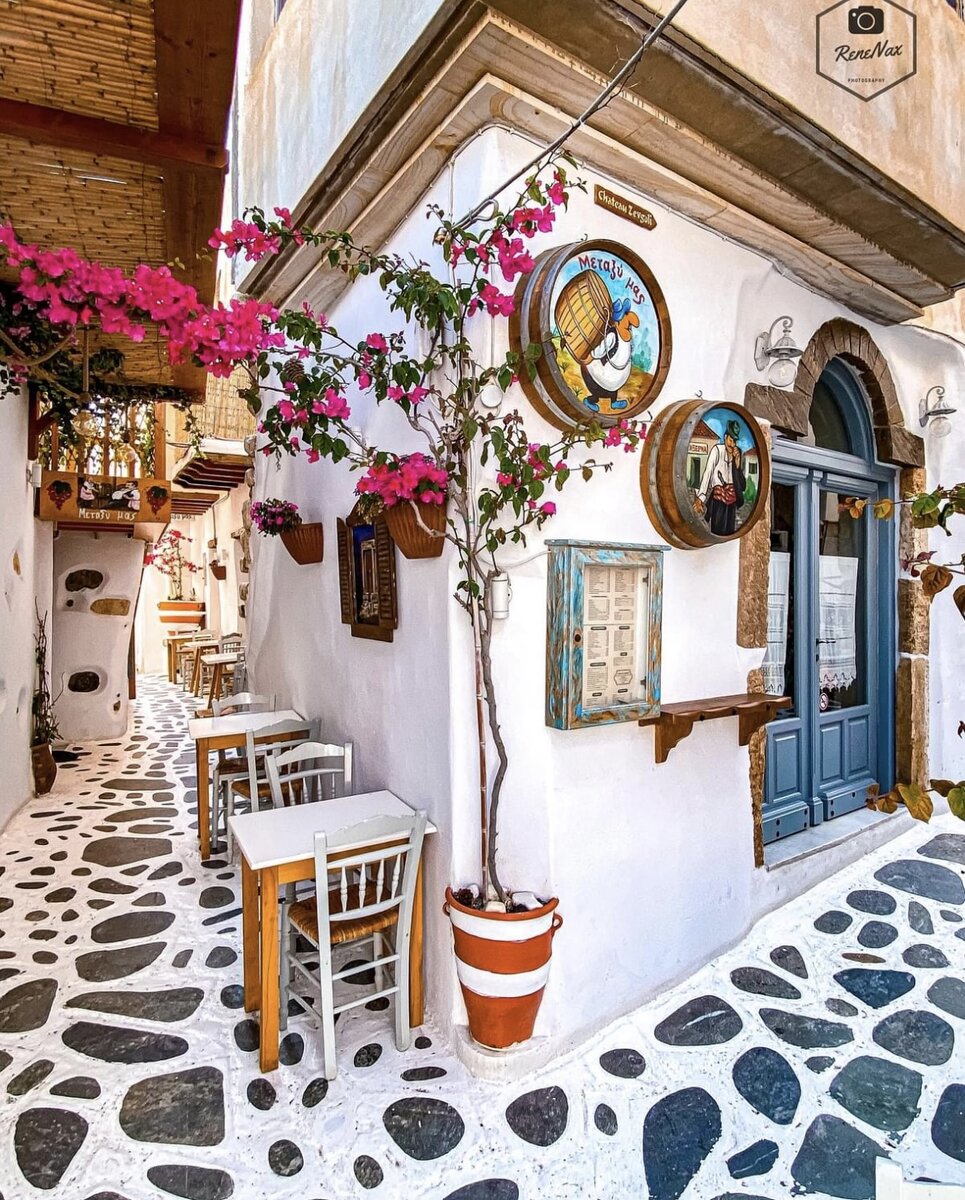 В архитектуре преобладает традиционный для Греции кикладский стиль – сочетание белого и синего оттенков. Правда, в этот микс хочется добавить цвет фуксии, ведь многие дома на острове украшены вазонами с цветущими растениями. Во время прогулки можно зайти в магазинчики, студии арт-дизайна, которые больше напоминают небольшие музеи.