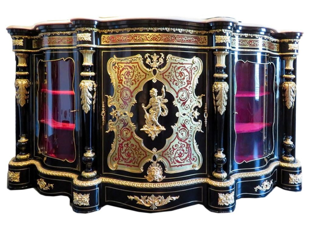 Некоторые из самых известных предметов антикварной мебели Boulle выполнены в яркой черно-золотой цветовой гамме из черного дерева и позолоченной бронзы (ормолу), что гарантировало, что мебель всегда будет выделяться в комнате.