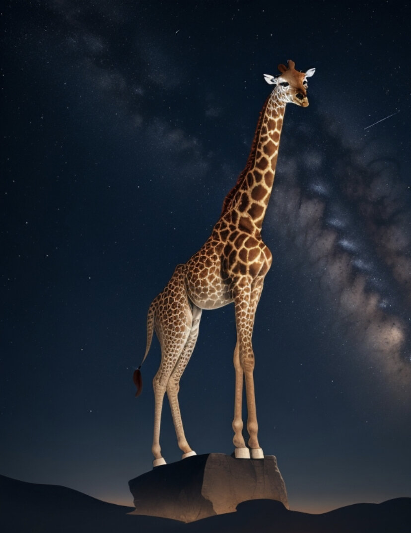 Жираф по имени Геоффри жил в волшебном африканском лесу. Он был необычайно высоким и красивым животным. Он имел красивую бархатную шёрстку с оранжевыми пятнами и глаза, которые всегда сверкали умом и добротой. Геоффри также был известен своей невероятной любознательностью. Однажды вечером, во время прогулки по лесу, Геоффри заметил светящуюся звезду, которая падала с небес. Это была Звезда Желаний, и говорили, что она исполняла желания. Геоффри решил загадать желание. Он загадал, чтобы все животные в лесу были здоровыми и счастливыми. В этот момент Звезда Желаний блеснула ярче и исчезла в небесах. На следующее утро Геоффри заметил, что что-то странное произошло. Все животные в лесу были полны жизни и энергии. Больные животные выздоравливали, а грустные становились радостными. Лес наполнился смехом и пением птиц. Геоффри стал героем леса. Его друзья были очень благодарны за его доброту и желание, которое исполнила Звезда Желаний. Он продолжал помогать другим животным и делать лес л