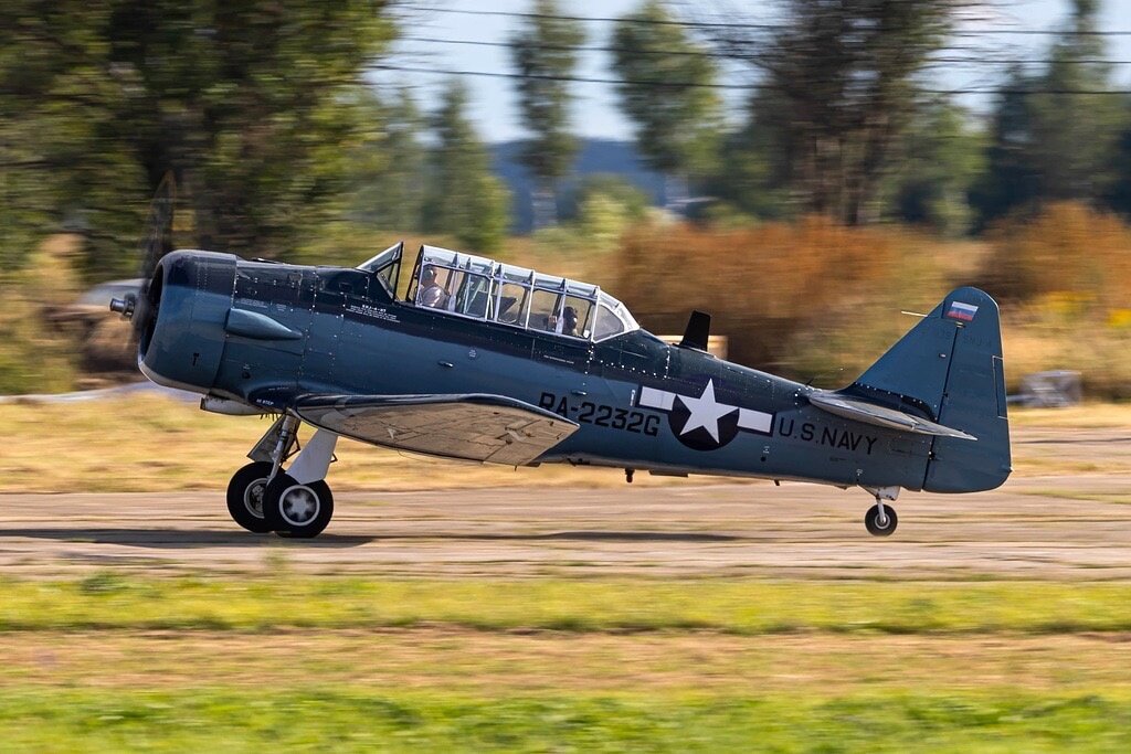 Судите сами. Только у нас, посетители экспозиции исторических самолётов Фонда «Крылатая память Победы» могут увидеть действующий экземпляр легендарного американского палубного самолёта North American SNJ-4-NT Непосредственно наш экземпляр (1943 года выпуска) был выкуплен музеем Вадима Задорожного у музея военной авиации на заводе истребителей в Вирджиния-Бич (штат Вирджиния США). В Россию самолёт доставили в 2015 году. После чего он перешёл под техническое управление Фонда «Крылатая память Победы» Бориса Осятинского. Почему легендарный? Дело в том, что в течение нескольких десятилетий машины семейства T-6 (NA-59) «Texan» скромно именовались во всём мире не иначе как «создатель боевых пилотов». Т-6 строился серийно с 1940 года и предназначался для второй ступени об