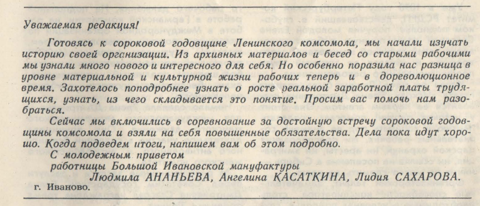 Октябрьские номера советских журналов были особенными - в этом месяце вспоминали о победе Великой Октябрьской социалистической революции (которая ныне в ряде учебников фигурирует всего лишь как октябрьский переворот). Историю пишут победители - и они же подводят итоги. Какие достижения может записать себе советская власть? Тут самое время показать, как выросло благосостояние трудящихся - и журнал "Работница" печатает обращение комсомолок в редакцию: