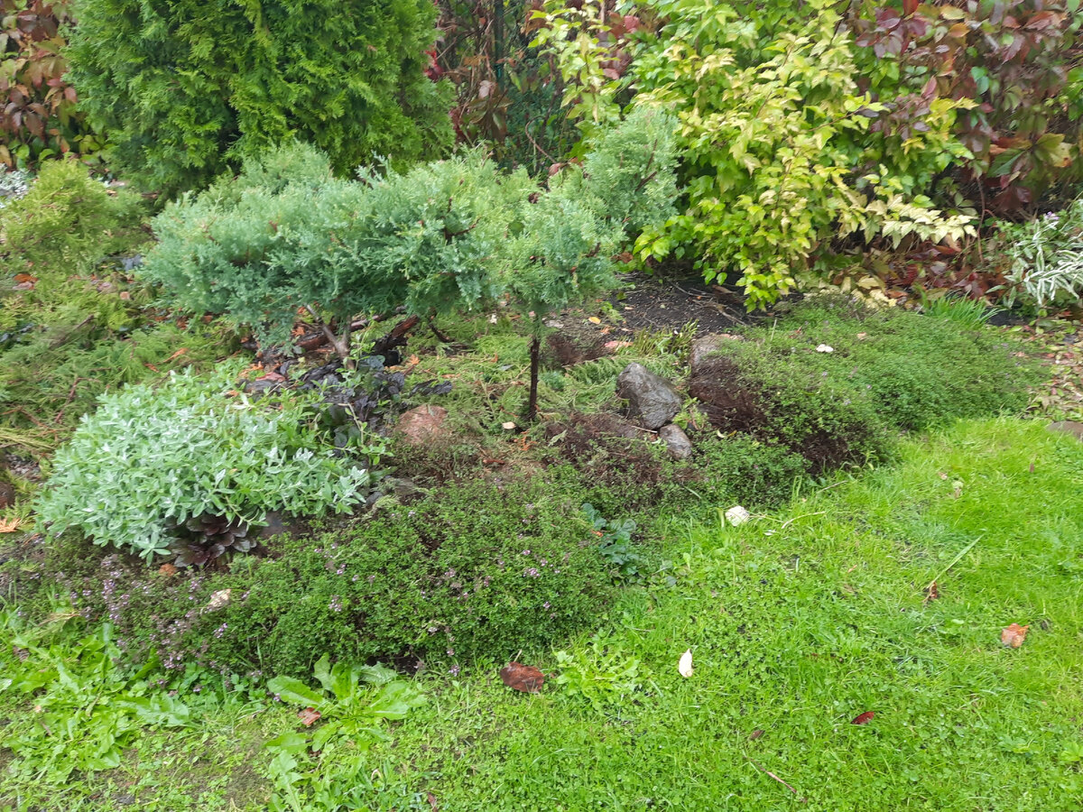 Это вариегатный почвопокровный, приехавший неделю назад. Интересно, как будет разрастаться.