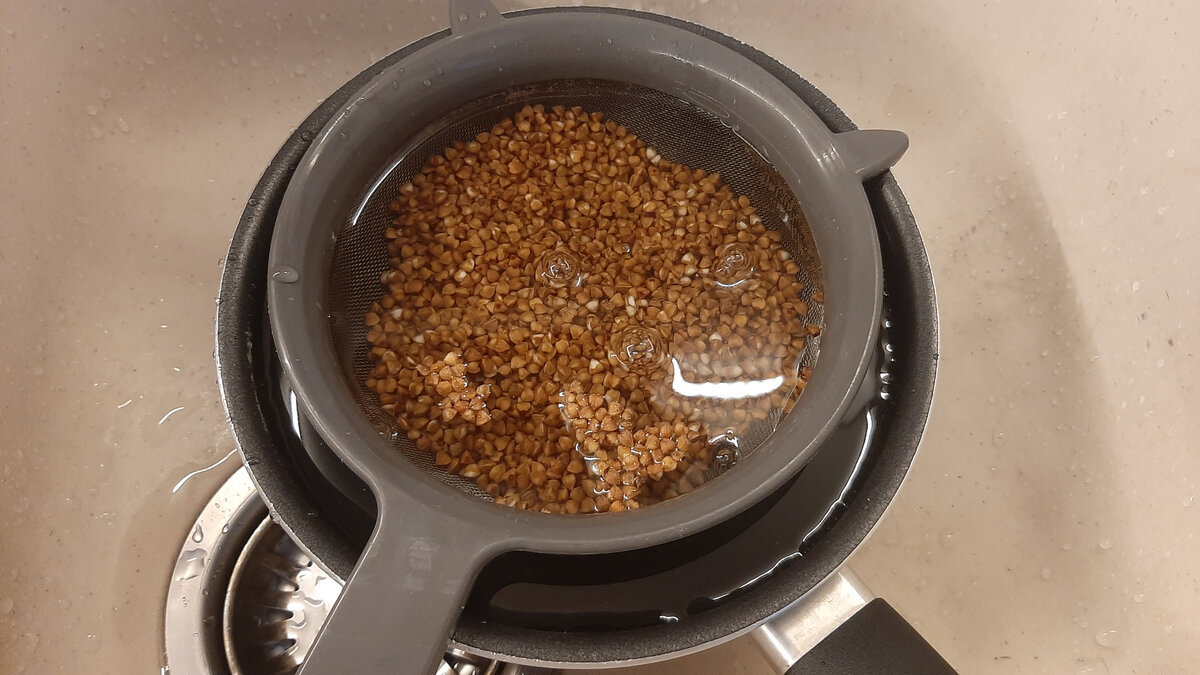 Здравствуйте, товарищи! Я не очень люблю варить крупы всякие типа гречки, риса и т.п., но иногда очень хочется. Больше всего я не люблю варить именно гречку, потому что она у меня получается сухая и невкусная, но однажды я узнал, что оказывается, ее можно запаривать. Я как-то попробовал, это оказалось проще и вкуснее. Нам понадобятся: 1. Гречневая крупа ½ стакана 2. Соль 3. Травки или специи (по желанию) Такого количества крупы хватит примерно на две порции. К делу! Сначала поставим чайник греться, а тем временем возьмем нашу гречку и промоем. Эта стадия в общем-то самая сложная, но мы ее немного облегчим мелким дуршлагом или сеткой, вот так например: Процесс примерно такой: заливаем водой, мешаем рукой крупу прямо в воде, сливаем, и так несколько раз, пока вода не станет более-менее прозрачной. Теперь высыпаем все в кастрюлю и заливаем кипятком на 20-30 секунд, чтобы все это дело прогрелось хорошенько. Теперь воду сливаем и солим. Если хочется добавить какой-нибудь колорит, добавляем