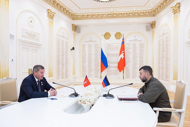 Андрей Бочаров и глава Донецкой Народной Республики Денис Пушилин провели рабочую встречу в администрации Волгоградской области. Обстоятельный диалог состоялся в Зале Воинской и Трудовой славы. В центре внимания — вопросы реализации межрегиональных проектов развития, укрепления гуманитарных, образовательных и культурных связей. От имени жителей региона Андрей Бочаров поприветствовал Дениса Пушилина на героической сталинградской земле и передал жителям Донецкой Народной Республики слова искреннего уважения и поддержки. «Волгоградская область и Донецкая Народная Республика связаны историческими корнями, основа развития наших регионов, наших взаимоотношений заложена давно. Уверен, что у нас огромный потенциал для дальнейшего взаимодействия, и сегодня хотел бы обсудить вопросы консолидации наших возможностей для развития наших регионов и России в целом», - подчеркнул глава региона. Денис Пушилин поблагодарил губернатора, а в его лице всех жителей Волгоградской области за помощь, оказанную