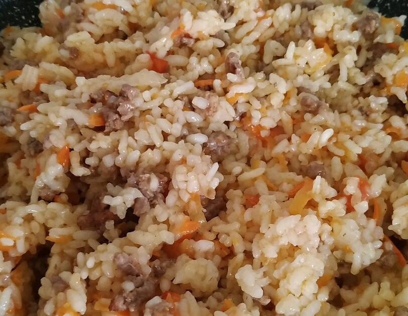 Вам понадобится : - фарш - соль по вкусу - рис - паприка - лук - морковь - по желанию зелень Приготовление : 1. Берём фарш, соль и паприка по вкусу. 2. Кладём фарш в мультиварку и обжариваем. 3. Морковь трём на тёрке, лук нарезаем кубиком. Обжариваем вместе с фаршем. 4. Добавляем в мультиварку рис и заливаем водой. 5. Ставим на режим плов. 6. По желанию добавить зелень. Приятного аппетита!!!