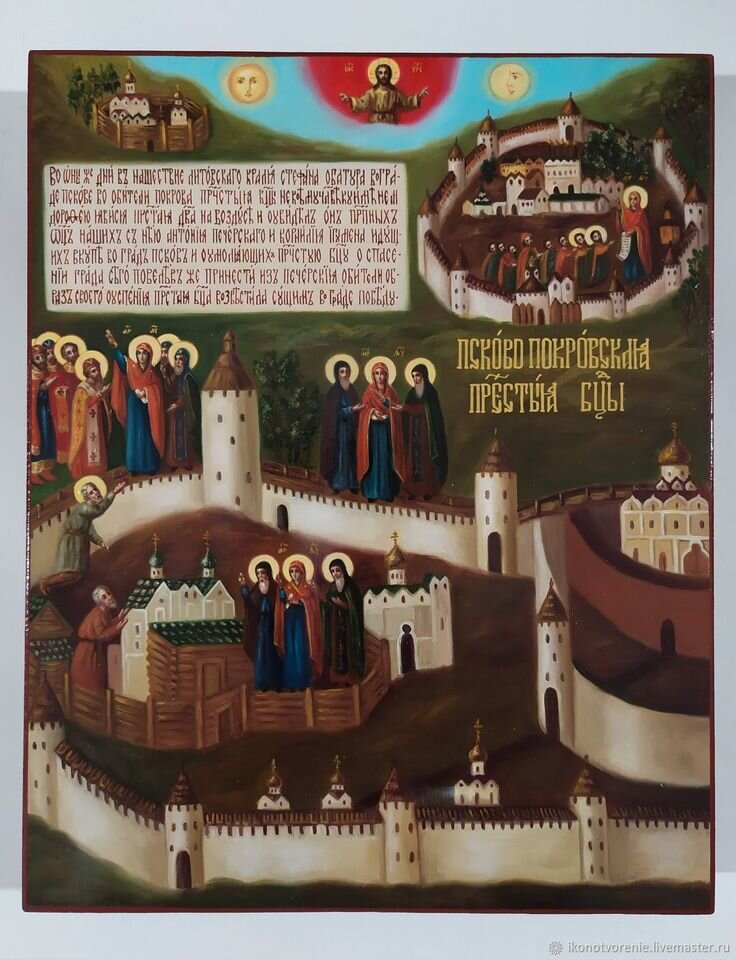 История этой иконы связана с осадой в 1581 году города Пскова польским королем Стефаном Баторием. За несколько дней до решительной атаки Пскова Баторием в дверях своей кельи сидел старец Дорофей и горько переживал за свой родной город. И вдруг он увидел на небе Божию Матерь, которая шествовала по воздуху. По одну сторону от неё был Антоний Печерский, а по другую - преподобный Корнилий. Владычица вошла в Покровскую церковь. И перед ней предстали все святители земли Русской, которые стали умолять Богородицу спасти город. Она умилосердилась и позвала к себе старца Дорофея. Она повелела ему немедленно идти к воеводам, сказать им, чтобы молились прилежно. А так же Божия Матерь показала, куда надо поставить пушки и куда стрелять. Всё было сделано так, как приказала Пречистая. Бой был очень тяжелым, но ляхи были разбиты. В благодарность Матери Божией на этом месте было решено воздвигнуть храм, а так же написать икону. На этой иконе Богородица изображена вместе с преподобным Антонием и Корнил