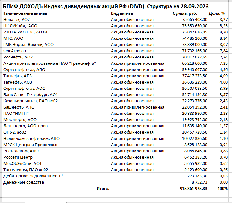БПИФ ДОХОДЪ Индекс дивидендных акций РФ (DIVD). Структура порфеля за разные периоды
