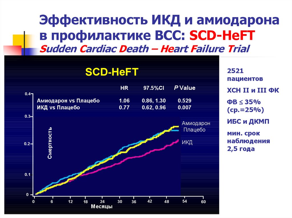 В общем, получается, что антиаритмики — это лекарства в основном для устранения неприятных симптомов аритмии, но не для улучшения прогноза. Одно из доказательств этому - на рисунке ниже. По горизонтальной оси - месяцы. По вертикальной - относительная доля умерших от численности группы, причем групп было три: первая принимала амиодарон, вторая - имитацию лечения (плацебо), третьей устанавливали кардиовертеры-дефибрилляторы. Как видите, каждый месяц число умерших возрастало во всех группах. Группы амиодарона и плацебо фактически идут рядом и переплетаются. Т.е. амиодарон равен плацебо по влиянию на смертность у данного контингента - больных с сердечной недостаточностью с низкой сократимостью. И только в группе имплантированных кардиовертеров-дефибрилляторов есть прогресс: число смертей явно меньше, но тем не менее и эти люди умирали - 20% за 4 года. Кстати, на примере этого исследования можно понять, что хотя результаты для фарминдустрии были плохими в данном случае, это не помешало опубликованию этих данных, и никто их не подтасовывал. Аналогичные негативные для фарминдустрии результаты были получены и во многих других исследованиях. Это я пишу в пику конспирологическим версиям о том, что всё в этой сфере куплено, подтасовано и сфальсифицировано.