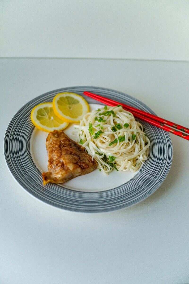 Подавайте лапшу с рыбным филе и долькой лимона.