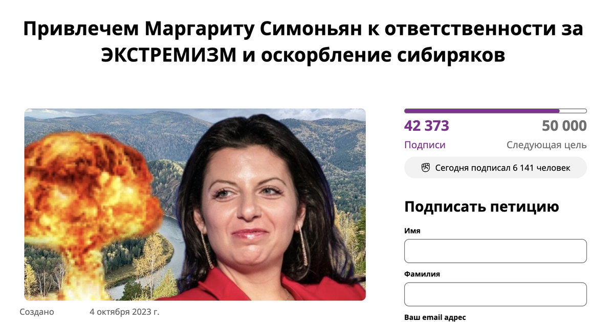 Петицию с требованием привлечь Маргариту Симоньян к ответственности за экстремизм и оскорбление сибиряков набрала 42 тысячи подписей за несколько дней. В своей передаче главред RT заявила, что в ядерном взрыве над Сибирью нет ничего страшного.