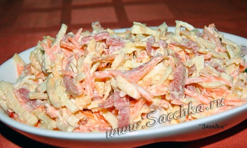 Салат называется «Загадка», потому что гости не могут угадать один из главных ингредиентов - яичные блинчики.