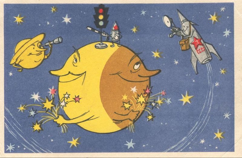 7 октября 1959 года сбылась мечта целых поколений астрономов — благодаря советской автоматической межпланетной станции «Луна-3» человечество впервые получило фотографии тёмной, невидимой с Земли стороны Луны. Обложка декабрьского новогоднего номера журнала «Крокодил» 1959 года, посвящённая лунным успехам СССР в уходящем году
