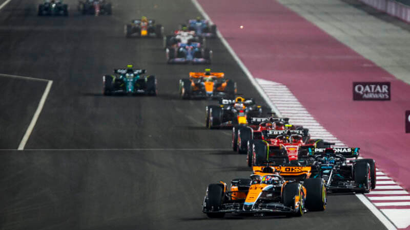 Пилот «Red Bull» Макс Ферстаппен завоевал чемпионский титул Формулы-1 в сезоне 2023 года, заняв второе место в спринтерской гонке Гран-при Катара, которую выиграл гонщик «McLaren» Оскар Пиастри. Спринт, состоящий из 19 кругов, включал три периода машины безопасности и характеризовался тем, что гонщики предпочитали использовать мягкие шины, добиваясь больших успехов на ранних этапах гонки.. Трехсторонняя авария, положившая начало третьему периоду машины безопасности, выбила Серхио Переса и закрепила третий чемпионский титул для Ферстаппена. На старте Пиастри удерживал лидерство с поула, в то время как его партнер по команде в первом ряду Ландо Норрис и Ферстаппен на шинах Medium, были пройдены машинами, стартовавшими на мягких шинах — Джорджем Расселом, Карлосом Сайнсом и Шарлем Леклером. Затем гонка была нейтрализована из-за того, что машина безопасности была вызвана на трассу вскоре после того, как Лиам Лоусон вылетел из задней части пелетона во втором повороте, где он, похоже, потеря