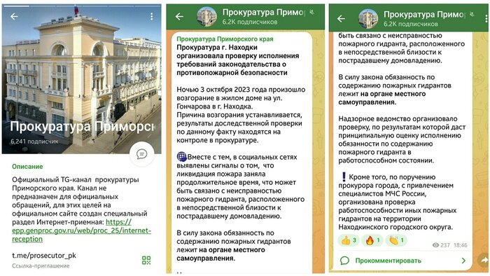 По пожару на улице Гончарова, дом 39а, где пожарный гидрант, расположенный прямо у ворот этого дома - был в нерабочем состоянии - начала проверку Прокуратура Находки, сообщает в своём официальном телеграм-канале Прокуратура Приморского края. Как сообщает Прокуратура Приморского Края - обязанность по содержанию пожарных гидрантов - лежит на органе местного самоуправления. То есть - на Администрации Находкинского городского округа, насколько я понимаю. О самом пожаре я писал на Пикабу дважды: Сгорел дом. Пожарный гидрант возле него - был неисправен. Пожарные машины ездили заливаться водой на другую улицу. У соседей сгорел дом, потому что в пожарном гидранте прямо у ворот - не было необходимого напора воды. Со ссылкой на эти посты я вчера написал ряд обращений: к Губернатору Приморья, МЧС Приморского края и в Прокуратуру Находки - с просьбой выявить ответственные организации, в обязанность которых входит обеспечение работоспособности пожарных гидрантов в городе и осуществить, собственно,