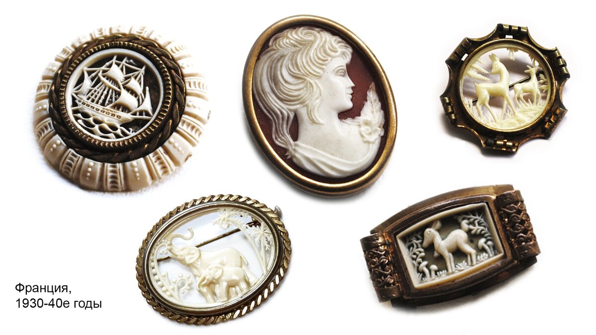 Украшения из целлулоида отличаются особой легкостью и имеют чаще всего филигранную резьбу, а также могут быть целиковыми или полыми, реже попадаются с инкрустацией кристаллами. Чаще всего встречаются изделия разных оттенков слоновой кости, перламутра и черепахового панциря, но также бывают разных цветов и даже полупрозрачные или покрытые аккуратной ручной росписью. В основном украшения из целлулоида изображали различные фигурки людей, животных и птиц, флоральные мотивы. Это очень трогательные, романтичные украшения, часто миниатюрные и «воздушные».