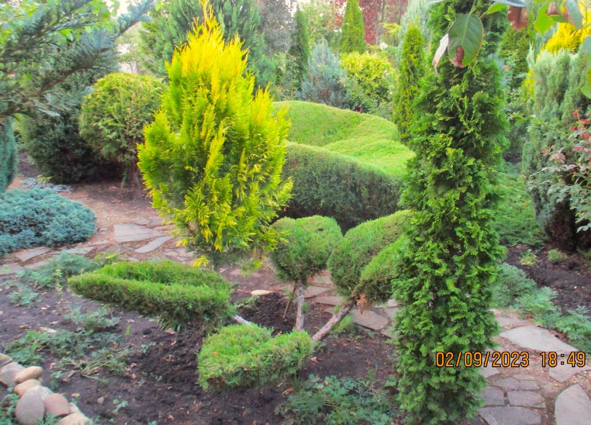 В этой статье я расскажу о хвойных растениях, которые растут в моём саду. Некоторые я стригу, некоторые не стригла ни разу, они в этом не нуждаются. На этом фото жёлтая туя "Форевер Голд", можжевельник "Олд Голд" и справа туя "Дигрутс Спайр". Сажала их все маленькими и они не мешали друг другу. У нас в Краснодарском крае хвойные растут быстро, надо было что- то предпринимать. У туи "Форевер Голд" вырезала нижние ветки, чтобы можжевельник рос свободно. Но у можжевельника пришлось позже удалить одну ветку, которая упиралась в тую "Дигрутс Спайр". Эту тую я никогда не стригла. У неё прекрасная форма. Высота почти 2 метра , а диаметр около 30 см. Мне всегда хотелось посадить хвойные с цветной хвоей, чтобы они не сливались в одну зелёную массу.