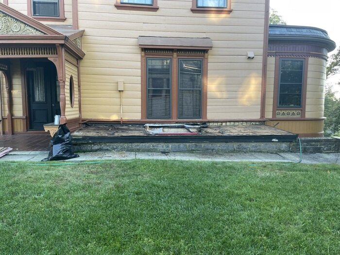 Давно не писал про дом, так что пора. Осенью я обычно беру напрокат подъемник для текущего ремонта крыши, но в этом году он не понадобился. Фундамент дома выходит за периметр стен и образует вот такую небольшую плоскую крышу. Там внизу находится прачечная и чтобы прислуга не жгла ценный газ для освещения, в крыше имеется окно. Окно уже давно было заколочено а сама металлическая крыша в нескольких местах стала подтекать. Я долго размышлял в плане сохранения окна, но в итоге решил его ликвидировать. Вообще, в плане реставрации старых домов я стараюсь сохранять по максимуму абсолютно все. На мой взгляд, историческую ценность представляют даже самые мелкие детали. Но в данном случае (и благодаря чудесным современным технологиям, вроде электрического освещения) я решил не усложнять. Обрешетка в нескольких местах подгнила, так что заменил прохудившиеся доски и пару балок. Особенно плох был левый угол - там все в труху. Похоже из отсутвия правильного отлива. Прохудившиеся доски (там вагонка)