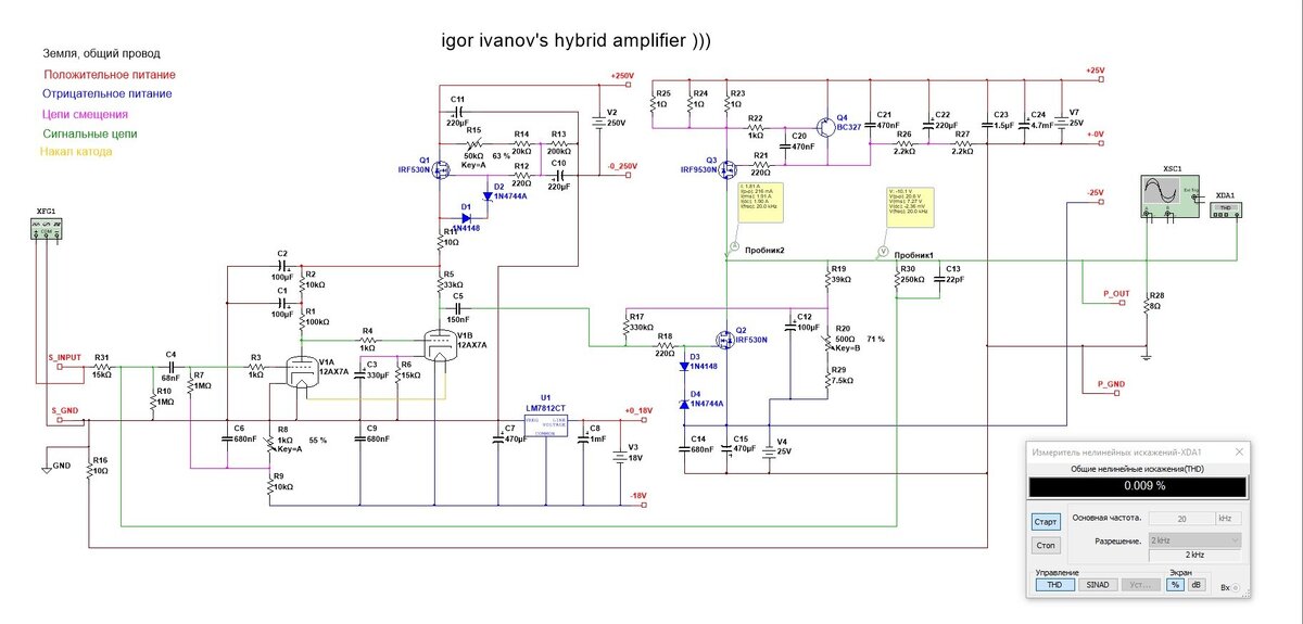 Всем доброго, под вот этой старой статьёй, один из моих постоянных читателей и верный подписчик, подкинул пищу для ума. Как только освободится пара-тройка свободных от приёмников часов, обязательно попробую эту схему повторить в железе. Ниже пояснения к схеме от автора: Раз уж дело дошло до ламп и класса А с однотактами, вот хочу тоже предложить свою ложку дёгтя в бочку с мёдом. Собственно на скрине всё видно и так, а чего не видно сейчас расскажу. При стандартном входном напряжении 1в амплитудного, на выходе практически 20в. Ток покоя как и положено классу А 2А при +-25В на выходном каскаде который сам по себе практически примитивный усилитель тока, а раскачивает его ламповый предварительный усилитель на сдвоенном триоде, подойдут любые, хоть 6н23п. Ток первой лампы 1мА, второй 5мА. Ток 5мА необходим для прокачки затвора транзистора. Первый триод с фиксированным смещением, второй с авто и непосредственной связью между каскадами. Анодное напряжение ламповой части стабилизированно стаб