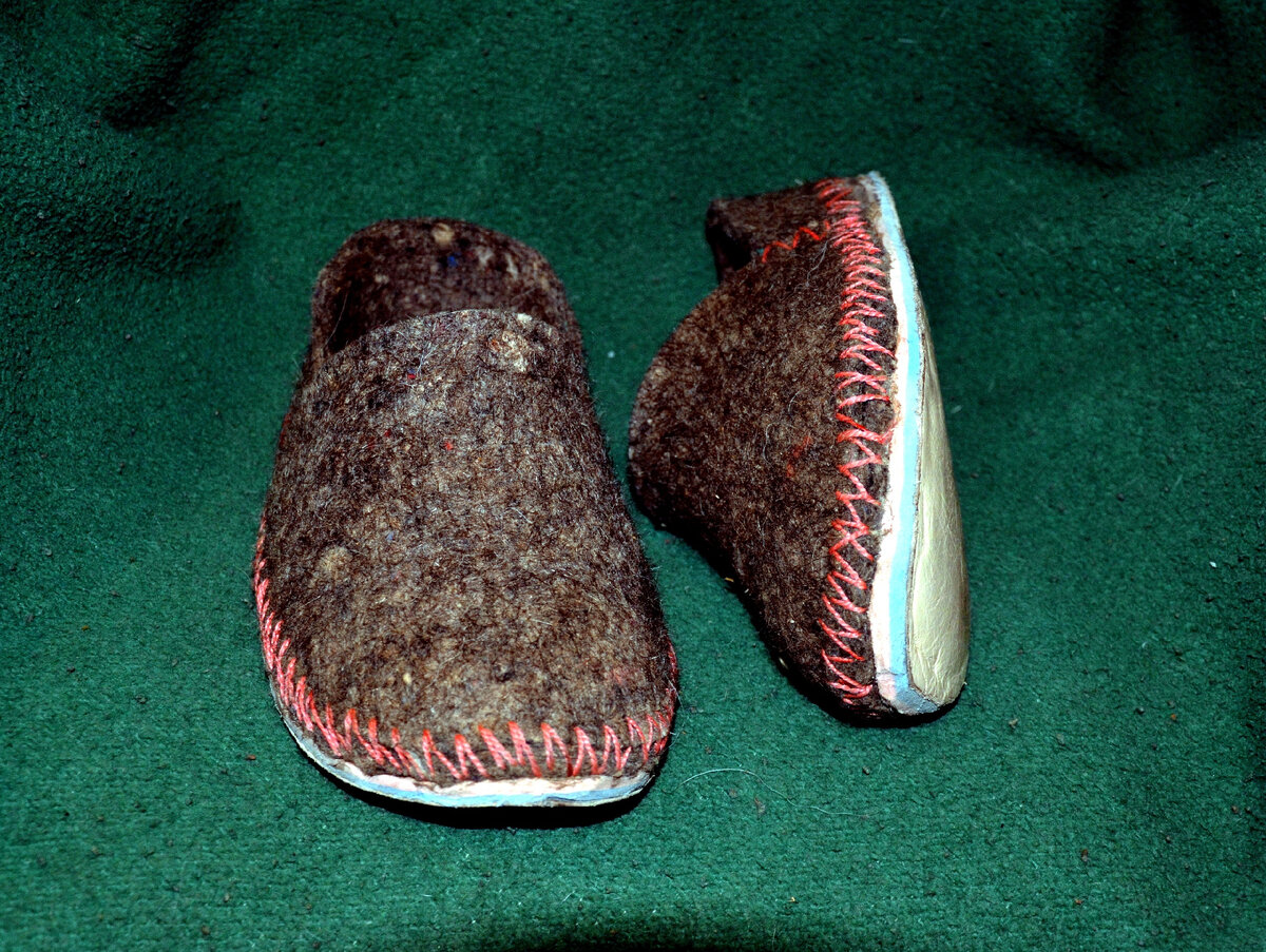 Накрылись мои покупные тапочки. В город лень выбираться, а тут случайно, обнаружился кусок войлока. А почему бы нет, подумал я и, вооружившись ножом и иглой, соорудил себе теплые зимние тапки. С учетом того, что с войлоком я работал аж в 1990 году (шил дрессировочный рукав), то времени было потрачено много. Целых 4 часа возился.