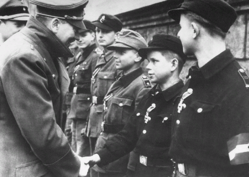Сопровождаемый гостями и кинохроникером, фюрер медленно прошелся вдоль короткого строя, апатично потрепав по щекам нескольких одетых в униформу подростков и, брызжа слюной, обратился к присутствующим с бессвязной речью.
