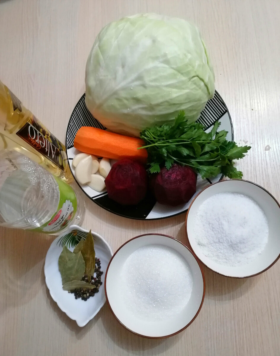 Всем привет! Осень всё увереннее вступает в свои права. Стало холодно, сыро, неуютно. И, как правило, со сменой времени года, меняются наши вкусовые предпочтения. Хочется чего-то необычного. Сегодня будем готовить очень простое блюдо, с которым справится любой человек, даже далёкий от кухни. Нам понадобится совсем немного ингредиентов, которые найдутся у любой хозяйки. Готовим маринованную капусту со свёклой, в кулинарии её называют "Пелюстка", что означает лепесток. Берём 2 кг капусты, 300 гр. моркови, 300 гр. свёклы, 100 мл растительного масла, 150 мл уксуса, 2 ложки соли, 5 ложек сахара, 7 зубчиков чеснока, пучок петрушки, 5 шт. лаврового листа, смесь перцев 15 горошин. Все овощи тщательно моем, у капусты убираем все твёрдые прожилки и нарезаем небольшими кубиками, которые потом разделятся на лепестки, отсюда и название блюда. Свёклу и морковь натираем на тёрке для корейской моркови. Чеснок нарезаем тонкими пластинами, петрушку нарезаем не очень мелко. В контейнер слоями вык